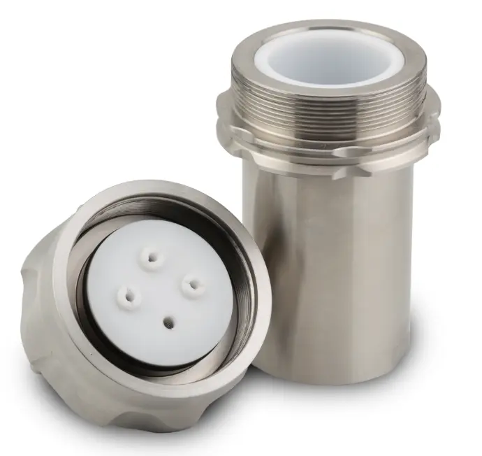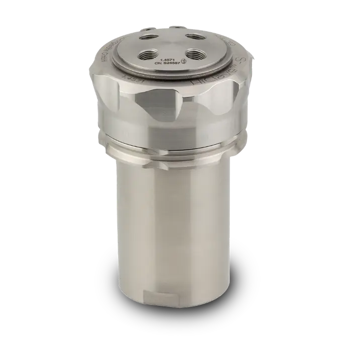 Als Werkstoff stehen Edelstahl oder Hastelloy® zur Verfügung, wobei Edelstahl optional mit Tantal beschichtet oder mit einem PTFE-Einsatz ausgestattet werden kann.