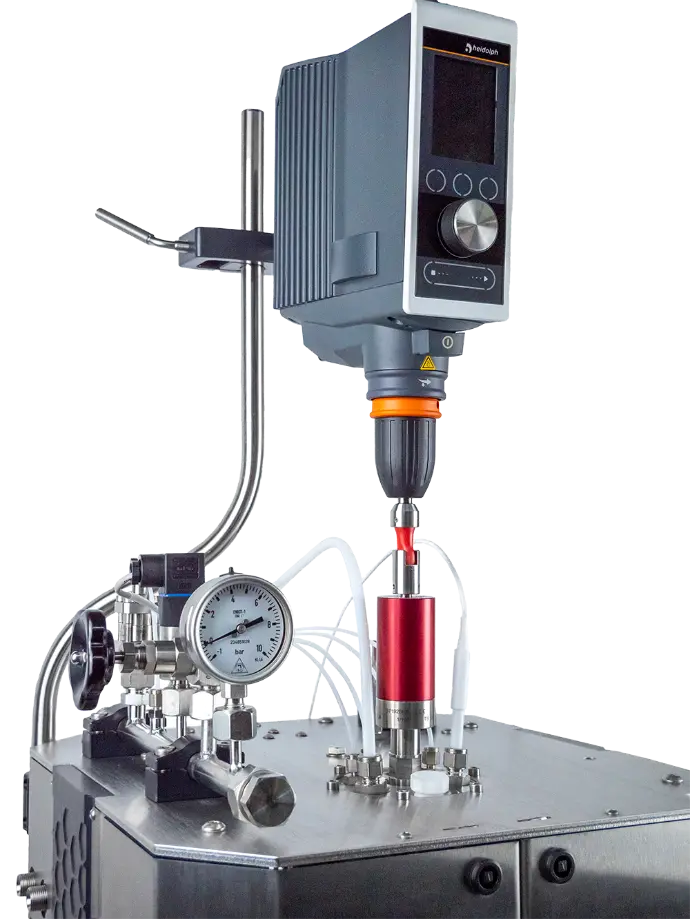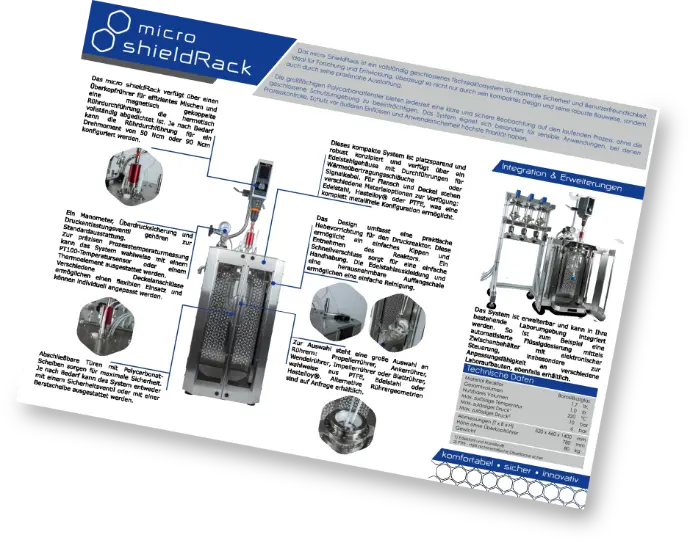 Das shieldRack verfügt über einen Überkopfrührer für effizientes Mischen und eine magnetisch gekoppelte Rührdurchführung, die hermetisch vollständig abgedichtet ist. Je nach Bedarf kann die Rührdurchführung für ein Drehmoment von 50 Ncm oder 90 Ncm konfiguriert werden.